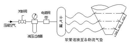 該流化器裝于物料易架橋的料倉(cāng)內(nèi)壁,通過(guò)外接的壓縮空氣分流在皮碗周圍,